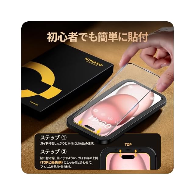 【たったの3ステップ・初心者でも綺麗に貼れる】ガイド枠をはめる→上側に合わせて、フィルムを置く→軽く押すだけで自然に吸着。初めての方でも簡単に貼り付けられるよう、専用の貼り付けガイド枠を同梱しています。いphone15と保護フイルムがズレることなく、だれでも簡単にフィルムを貼ることができます。