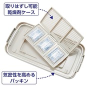 フタの裏に取り外し可能な乾燥剤(付属)用ケースを装備。気密性を高めるシリコンパッキンで湿気やほこりから収納物を守ります。