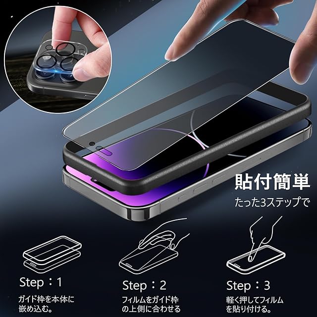 【ガイド枠付き・貼付け簡単】 ガイド枠をはめる→上側に合わせて、 いPhone14Promax ガラスフィルムを置く→軽く押すだけで自然に吸着。 フィルム貼りことが苦手の方でも簡単に貼る事が可能です。また、縁にラウンドエッジ加工が施されており、iPhone本体の縁に適度なスペースを残すデザインとなっており、フィルムの剥がれや浮き上がりを防止し、スマホケースと干渉せずに快適に使えます。