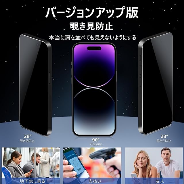 【覗き見防止・プライバシーフィルム】 覗き見防止技術により、左右の視野からの視線を防ぎ、画面のプライバシーを守ります。電車などでも安心のプライバシー保護フィルムです。MINIKAのiPhone14Promax 覗き見防止フィルムは斜めから見るとブラインドルーバーにより画面が真っ黒になりますが、真正面から見ると高透過率ではっきり見ることが出来ます。
