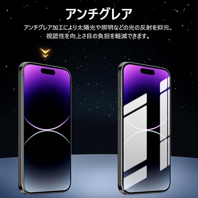 【アンチグレア・指紋防止・高感度タッチ】 アンチグレア(非光沢)タイプのさらさらで快適な操作感。光の反射を軽減し、より目に優しくちらつきを抑えます。同時に、iPhone14プロマックス ガラスフィルムには撥油コーティングが施されており、指紋や汚れなどに強くなめらかな操作感を実現、付着した汚れなどは簡単に拭きとれます。こちらは高耐久撥油コーティングが施され、つるつるな滑り感を実現!ゲームをする人におすすめです。