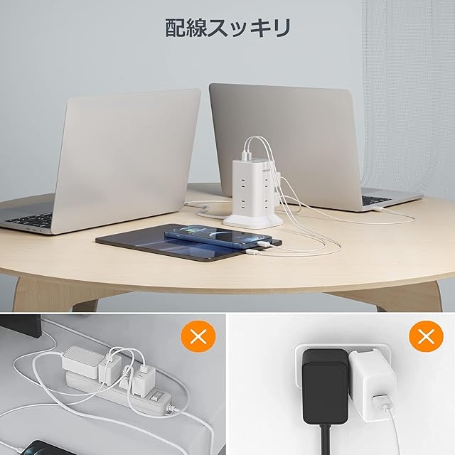 【一台11役のタワー型電源タップ usb】このタワー型電源タップは、8つのACコンセント合計1500W対応)、1つのUSB-Cポート、2つのUSB-Aポートを搭載した多機能モデルです。ACコンセントの間隔が広く設計されているため、大型のACアダプターもストレスなく接続可能。USBポートにはスマートICを内蔵し、最適な電流を自動調整するため、急速充電が可能です。さらに、コンパクトサイズ(10x10x12.7cm)で軽量設計のため、持ち運びも便利。家庭やオフィス、イベント会場など、さまざまなシーンで活躍します。