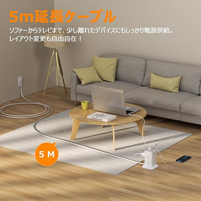 【USB-Cポート付の延長コード 5m】この延長コード 5mは、2つのUSB-Aポートと1つのUSB-Cポートを備えた便利なモデルです。USB-Aポート単体での出力は5V-2.4A、USB-Cポート単体での出力は5V-3Aと、急速充電に対応。スマートフォンやタブレットなど、複数のデバイスを同時に充電できます。5メートルの長さを活かし、リビングルームのソファ周りやワークスペース、小型イベント会場など、中距離での使用に最適です。