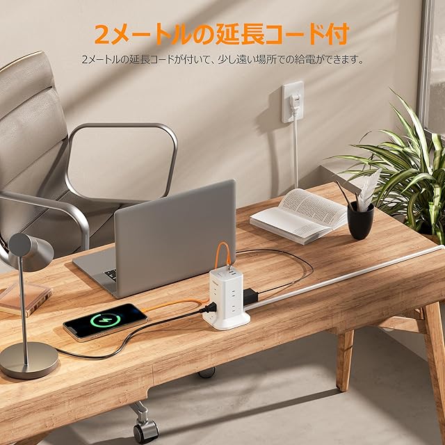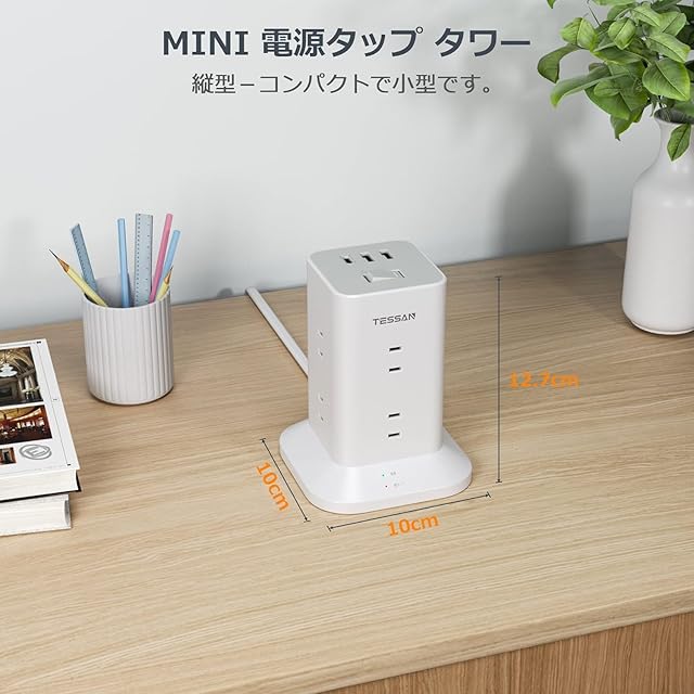 タワー型 電源タップ usb付き 延長コード 2m このタワー型延長コードは、コンパクトで多機能なデザインが特徴です。8つのACコンセント(合計1500W対応)に加え、2つのUSB-Aポートと1つのUSB-Cポートを備えており、スマートIC内蔵により、最大5V-2.4Aの高速充電が可能です。 主な特徴: 雷ガード機能付き: 雷サージからデバイスを保護し、LEDインジケータで動作状態を確認可能。 180°回転プラグ: 狭いスペースでも使いやすいデザイン。 耐熱性ABS 94V0樹脂: 高温環境でも安心して使用可能。 一括スイッチ: 簡単に電源をON/OFF切り替え。 過負荷保護機能: 安全に配慮した設計で、過剰な電流を自動遮断。 コンパクトサイズ: 10cm x 10cm x 12.7cmの小型設計で、場所を選ばず設置可能。 家中やオフィスでの使用に最適な、信頼性と利便性を兼ね備えた延長コードです。