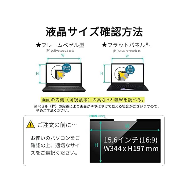 ■【プライバシー保護】視野角 60度、正面から見れると画面はクリアでも、隣の席からは真っ暗に映る偏光性を有する「覗き見防止フィルター」です。【対応機種】15.6インチ 縦横比16:9 寸法:フィルター部分のみ 344×197mm(縦幅/横幅のばらつき:+/-1mm程度)。上部の黒いマグネット部分は約9mm。画面とベゼルの高低差により画面がややぼやけて見える場合が御座います。