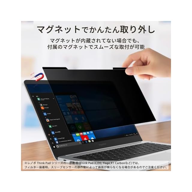■【安心作業】移動中やオフィスでの周りからの視線を防いで、安心してパソコン操作ができるのぞき見防止フィルターです。■※非対応機種:レノボ Think Pad シリーズの一部機種 (Think Pad X390, Yoga,X1 Carbonなど)では、フィルターを装着した際、スリープセンサーの誤作動によって画面が映らなくなる場合があります。その場合は、マグネットの位置をセンサーからずらして調整することで改善される可能性があります。
