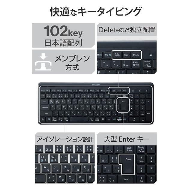 本格静音設計でありながら、軽い打ち心地を実現したワイヤレスタイプの静音薄型キーボードです。デスク周りスペースを有効に使えるコンパクトサイズで、数字入力に便利なテンキー付きです。
