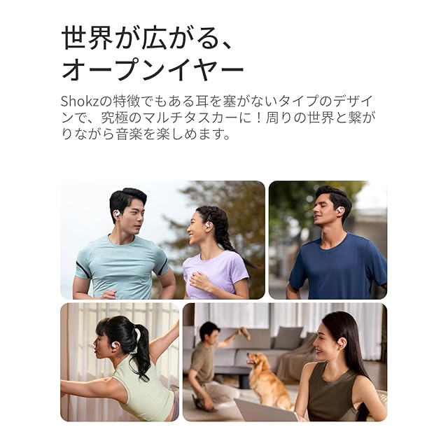 周囲が確認できる安全性:Shokzの特徴でもある耳を塞がないタイプのデザインで、究極のマルチタスカーに!通勤通学も、仕事中も、ワークアウトの時も、周りの世界と繋がりながら音楽を楽しめます。