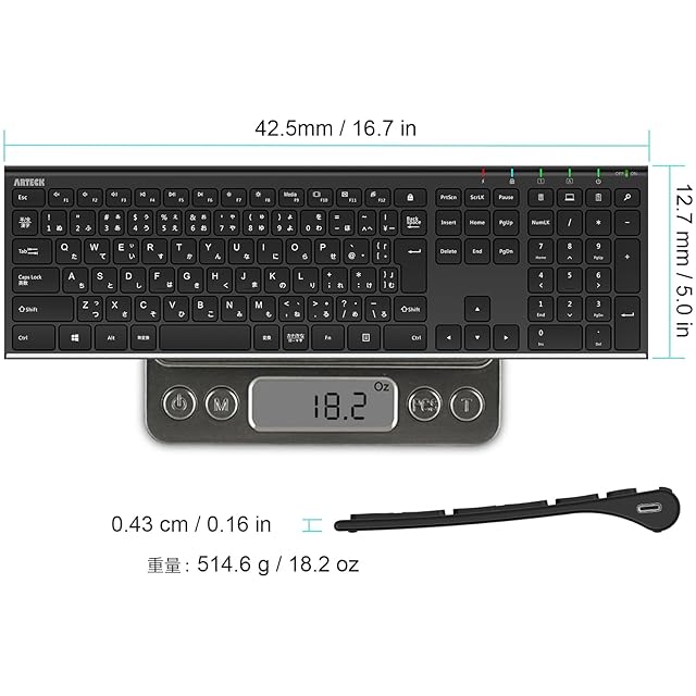 超軽量、薄型デザイン:コンパクトサイズ「16.9 X 4.9 X 0.6インチ」と軽い重量「14.9オンス/422.4g」、フルサイズで矢印キー、ショートカットキー、テンキーが付き、快適なタイピングが可能です。