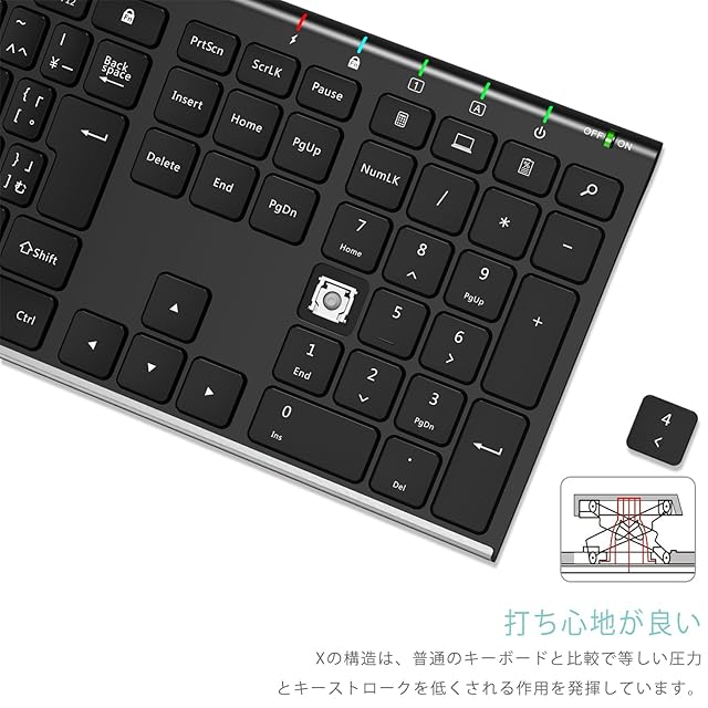 優れたデザイン:ステンレススチールの素材が頑丈な印象を与え、ロープロファイル、静穏タイプのキーで快適なタイピングが出来ます。このキーボードはテンキーが付き、テンキーが利用して数字などが入力したい場合、ナムロックをオンにしてください。