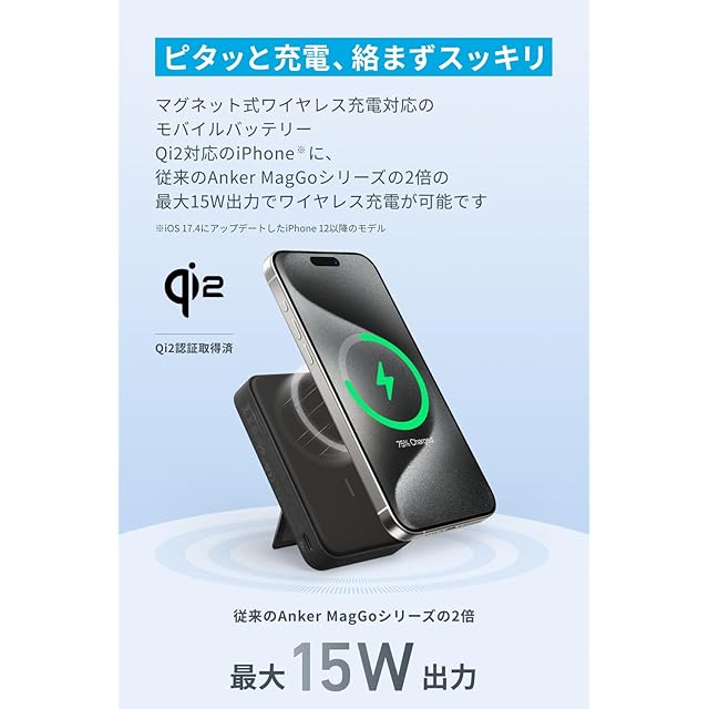 ピタッと充電、絡まずスッキリ:マグネット式ワイヤレス充電対応のモバイルバッテリー。Qi2対応のiPhone等に従来のAnker MagGoシリーズの2倍の最大15W出力でワイヤレス充電が可能です。