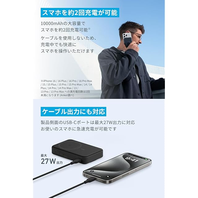 スマホを約2回充電が可能:10000mAhの大容量で、スマホを約2回充電が可能です。ケーブルを使用しないため、充電中でも快適にスマホを操作いただけます。