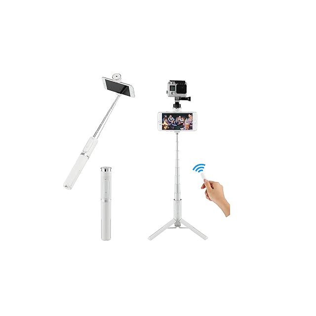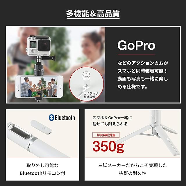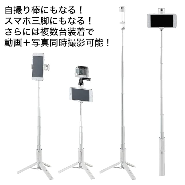 シャッターボタン付き自撮り棒が便利なスマホ三脚に大変身、先端にカメラねじ装備で2台撮影も可能。