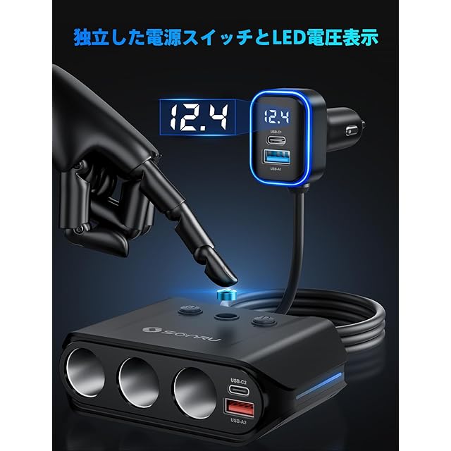 独立した電源スイッチ& LED 電圧表示:このシガーソケット3連、カー チャージャーには、シガレット ライター ソケットをそれぞれ制御する 3 つの独立したスイッチが装備されており、シガレット ライター デバイスのプラグを差し込んだり抜いたりする必要がありません。摩耗を減らし、機器の寿命を延ばします。SONRU シガレット ライター USB チャージャーには、車内の電圧出力をリアルタイムで監視できるインテリジェントな LED ディスプレイが付いています。車の電圧が 12V を下回ると、運転中に問題が発生するのを防ぐためにデジタル警告が点滅します。