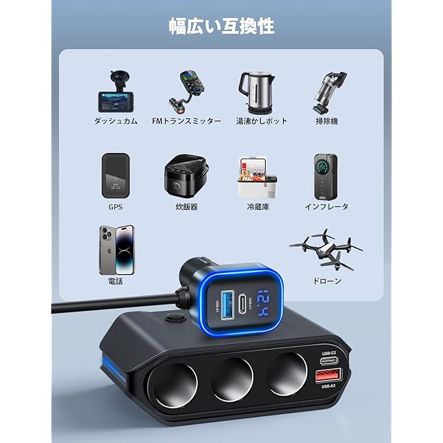 幅広い互換性:当社の車用プラグインアダプターコンセントは、SUV、トラック、MPV、RV、オフロード車などの12/24V車で広く使用されています。さらに、USB Cカーチャージャーは、ノートパソコン、MacBook、iPad、Switch、Kindle、カメラ、iPhone、Huawei、Samsung、Xiaomi、LG、Sony、Androidフォンなど、ほとんどのUSB電源デバイスと互換性があります。