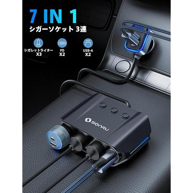 商品名:2025進化モデル SONRU 7 in 1 シガレットライタースプリッター、180W [デュアルPD & QC 3.0] カーチャージャーアダプター、12V/24V カーUSBアダプター マルチソケット 電圧計付き 急速充電 iPhone 16/15/14 Samsung Galaxy ノートパソコン カーデバイス用