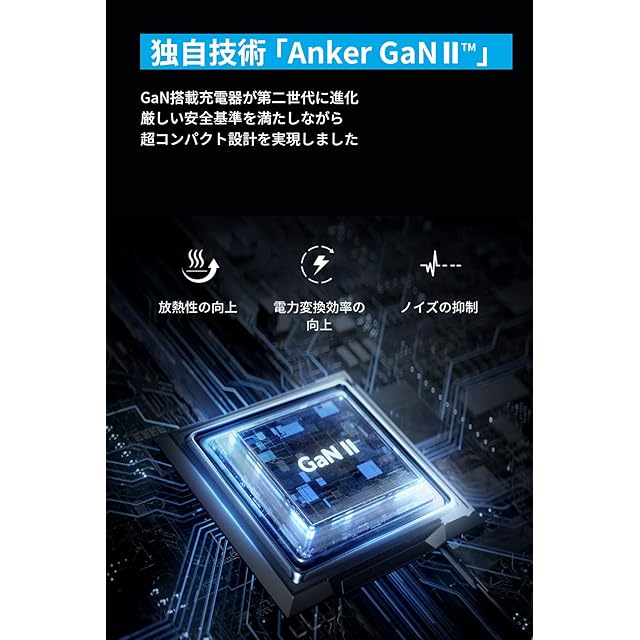 独自技術「Anker GaN II」 採用:GaN(窒化ガリウム)搭載USB充電器が第二世代に進化。電源ICと回路設計に革新を起こすことで、スイッチング周波数を高めて電子部品を省サイズ化するとともに、熱およびEMI(ノイズ)対策を施し厳しい安全基準を満たしながらさらなる小型軽量デザインを実現しました。