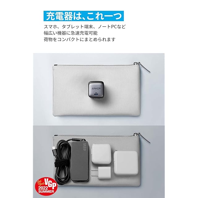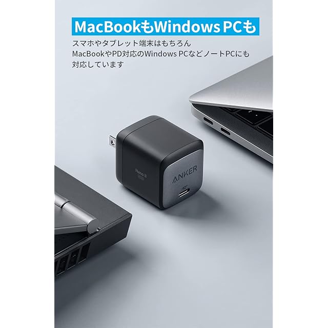 Anker Nano II 45W <br>スマホにもノートPCにも使える。持ち運びに便利な超コンパクト急速充電器 <br><br>製品の仕様 <br>サイズ:約 35 x 38 x 41 mm <br>重さ:約 68g <br>入力: 100-240V~ 1.87A 50-60Hz <br>出力: 5.0V=3.0A /9.0V=3.0A /15.0V=3.0A /20.0V=2.25A (最大45W) <br>PPS出力: 3.3V-16.0V=3.0A / 3.3V-21.0V=2.25A (最大45W) <br><br>充電器は、これ1つ <br>USB PowerDelivery(PD)対応の45W出力を備え、スマートフォンからノートPCまで幅広い機器に対応しています。利用機器毎に異なる充電器を持ち運ぶ必要はありません。 <br><br>iPhoneやAndroid()スマホにも急速充電 <br>一般的な5W出力の充電器に比べ、最大3倍速く充電できます(iPhone 12を0%から30分充電した場合での比較)。さらに、PDのオプションであるProgrammable Power Supply(PPS)規格にも対応しておりGalaxy S21などPPS対応のスマートフォンへのフルスピード充電も可能です。 <br><br>スマートなビジネススタイルへ <br>わずか4cm四方に収まる超コンパクト設計で、カバンやポケットにスムーズに収納できます。リモートワークや出張などの持ち運びに便利です。 <br><br>Windows PCにも充電可能 <br>最大45W出力を備え、MacBookだけでなく、PD対応のさまざまなWindows PCにも充電できます。一般的なWindows PCに同梱されているACアダプタに比べて非常に軽量かつコンパクトなサイズを実現しました。 <br><br>独自技術「Anker GaN II」を採用 <br>GaN(窒化ガリウム)搭載USB充電器が第二世代に進化。電源ICと内部基板部品に革新を起こすことで、スイッチング周波数を高めて電子部品を省サイズ化するとともに、熱およびEMI(ノイズ)対策を施し厳しい安全基準を満たしながらさらなる小型軽量デザインを実現しました。 <br><br>国際的な安全規格にも準拠 <br>電気用品安全法が定める技術基準への適合はもちろんのこと、国際的な安全規格であるIEC 62368-1の基準にも準拠しています。 <br>過電圧保護や電子回路のショート防止、温度管理など、Anker独自の多重保護システムにより、長く安全にお使いいただけます。 <br><br>幅広い対応機種 <br>iPhoneやiPad、MacBookに加えて、Apple Watchなど幅広いApple製品を充電可能。 <br><br>折りたたみ式プラグ搭載 <br>折りたたみ式プラグを採用し、コンパクトなデザインに仕上げました。旅行や出張など、持ち運びにも便利です。 <br><br>対応機種 <br>スマートフォン <br>- iPhone 12 / 12 mini / 12 Pro / 12 Pro Max / 11 / 11 Pro / 11 Pro Max / SE(第2世代) / XS / XS Max / XR / X / 8 / 8 Plus <br>- Galaxy S21 / S21+ / S21 Ultra / S20 / S20+ / S20 Ultra / S10 / S10+ / S10e / S9 / S9+ / S8 / S8+ / Note20 / Note20 Ultra / Note10+ / Note 10 / Note 8 <br>- Pixel 5 / 4 / 4 XL / 3 / 3 XL 他 <br>タブレット端末 <br>- iPad (第8世代) / iPad Air (第4世代) / iPad Pro (12.9インチ)(第5世代) / iPad Pro (11インチ)(第3世代) / iPad mini (第5世代) 他 ノートPC <br>- MacBook Air (M1、2020) / Air (Retinaディスプレイ、13インチ、2020) / Pro (13インチ、M1、2020) / Pro (13インチ、2020) / Pro 16インチ 他 <br>- Dell XPS 15 / XPS 13 / Inspiron 15 / Inspiron 14 他 <br>- Lenovo ThinkPad X1 / X390 / E490 / IdeaPad Slim 550 / IdeaPad Flex 550 他 <b