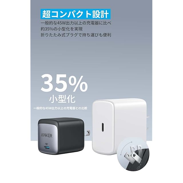超コンパクト設計:一般的な45W出力の充電器に比べ約35%小さなコンパクトサイズを実現。折りたたみ式プラグを採用し、どこにでも気軽に持ち運ぶことができます。