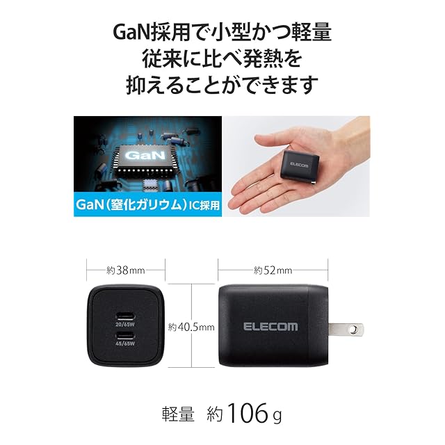 USB Type-C(TM)(USB-C(TM))ポートを2ポート搭載し対応するスマートフォン、タブレット、ノートパソコンなどを充電できる、GaN(窒化ガリウム)を採用し小型で軽量なUSB AC充電器です。※USB Power Delivery規格65Wまでで充電できる機器に限ります。