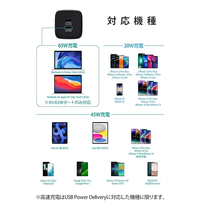 USB Type-Cポート単独使用時、機器に応じて出力が5V/3A、9V/3A、12V/3A、15V/3A、20V/3.25Aと可変し、iPhoneなどのスマートフォンから、iPadなどのタブレット、高性能なWindowsノートパソコンまで幅広く充電できます。