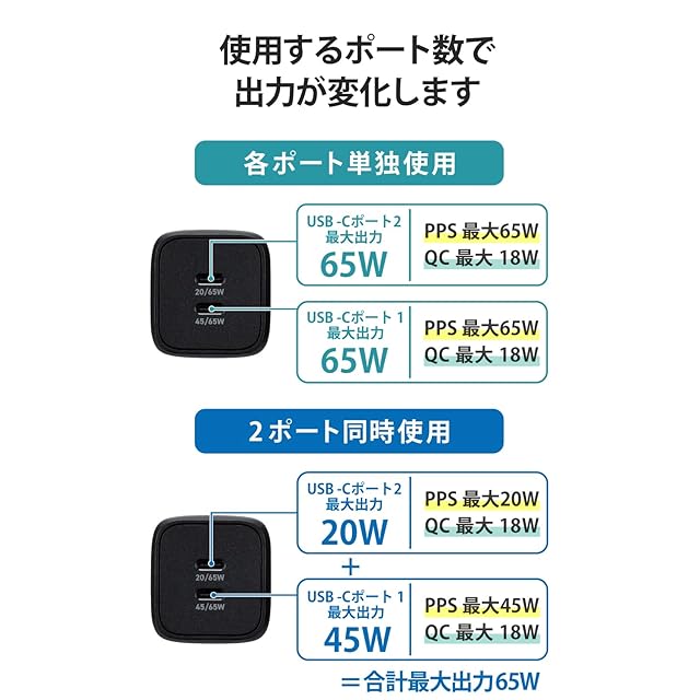 出力端子が2ポートあるので、iPhoneなどのスマートフォンとWindowsなどのノートパソコンを2台同時充電できます。※2ポート同時出力時は合計最大65Wとなります。