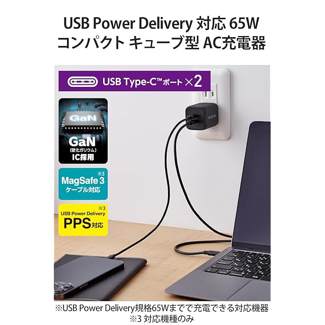 商品名:エレコム 充電器 Type-C 2ポート 65W USB PD対応 PPS対応 QC3.0対応 Magsafe3対応 折りたたみ式プラグ 【 iPhone16 15 iPad Macbook Air/Windows PC など対応】 ブラック EC-AC4365BK