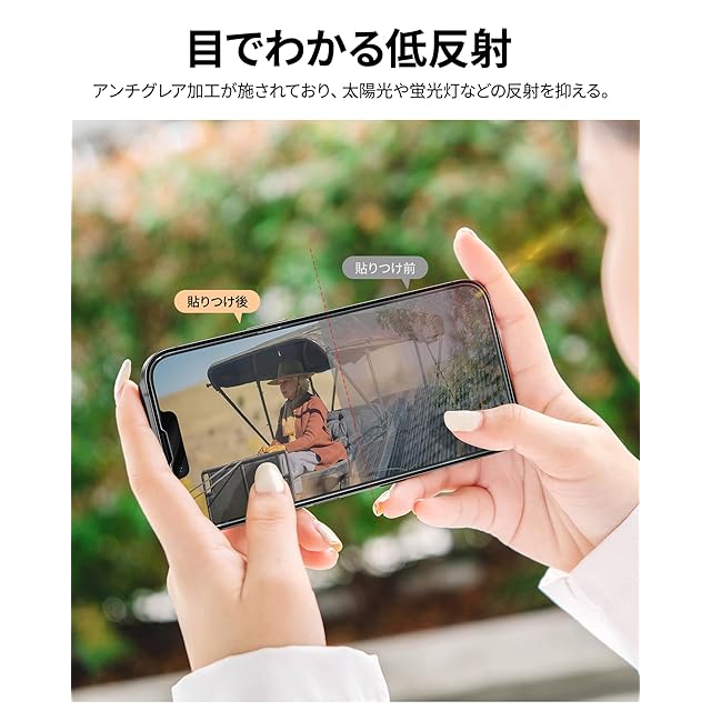 「反射低減・アンチグレア機能」NIMASO独自の反射防止コーティングの加工で、いPhoneスクリーンへの太陽光や蛍光灯などの反射を抑え、長時間スマホの画面を見ていても眼が疲れにくいです。視認性を向上させて画面を見えやすくすることで、目の負担を軽減でき、効果的に目を保護します。