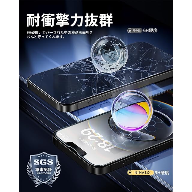 「9H硬度・耐衝撃性アップ」9H表面硬度ガラスを採用し、スマートフォンがカバンの中で、鍵などの鋭いものにぶつかっても傷が付きにくく、アイフォン16e/14/13pro/13の画面をしっかり保護します!特殊な飛散防止設計により、万一割れてしまった際にもガラス片が飛散することなく、高い安全性を実現しています。