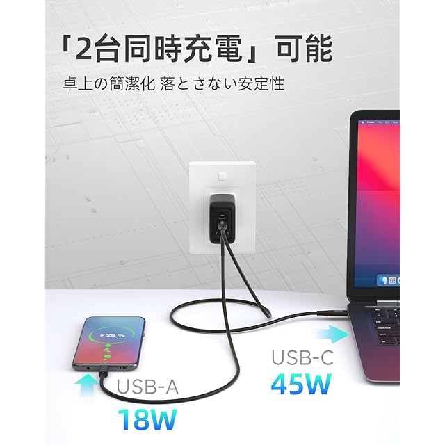 【PD充電器65W+2つのポート付き】SUKEYのタイプC充電器はType-Cポートを1つ、USB-Aポートを1つ搭載して、2台のデバイスを同時充電に対応。65Wの出力パワーはパソコンから携帯までの全てのUSB-Cデバイスに充電可能で旅行でも自家用でもこの一つで十分(単ポートも65W対応)