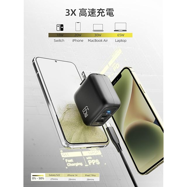 【幅広い互換性】SUKEY 65W USB-C充電器は、MacBook Pro 14’’ 2021(M1 Pro)、MacBook Pro 13、Macbook Air 2020、iPad Pro、iPhone15、 14、13、12、11 Pro、XS、XR、8、7 Plus、SE 2020、AirPodsPro、Switch、Galaxy Note 20、Note 20 Ultra、S23、S20、S10、Note 10 Plus、S9、S8、A8 2018、A5 2017、A51、A71、Google Pixel 4A 4 XL 3A 3 XL、P40 Pro、P40、P30、P20 Proに対応しています。また世界各国の電圧(AC 100-240V)に対応しているので海外旅行や出張に大活躍です。