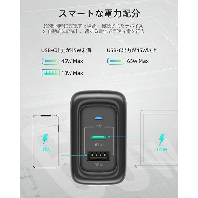 商品名:SUKEY PD 充電器 65W タイプC 急速充電器 折り畳み式 2ポート(USB-C*1とUSB-A*1) GaNII窒化ガリウム Type-C 充電器 PD3.0 PPS規格対応 MacBook iPad Pro iPhone Galaxy Android各種 その他USB-C機器対応 PSE技術基準適合 ブラック
