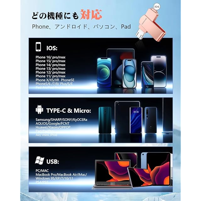 【最新4in1設計】/USB-C/USB3.0/MicroUSBの4in1端子を搭載。16Pro Max/16シリーズはもちろん、最新MacBook Pro(M3チップ搭載)まで幅広く対応。usbメモリ タイプc端子はUSB3.0 Gen1規格で最大転送速度を実現。 usbメモリ phone対応はPhone16/15/ 14 /13/12 /SE /11/XR/XS Max/XS /X /8 Plus/8/Pad Air(第1/2/3世代)/ MacBook(Pro/Air)/pad mini(第1/2/3/4/5世代)/Pad(第5/6/7/8/9世代)アイフォン全シリーズ/ パソコン/ Type-Cスマホ/ Androidスマホ /タブレットなどとデータ移行 互換性のあるusbメモリ。