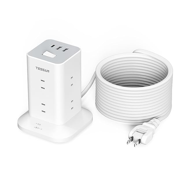 タワー型 電源タップ usb付き 延長コード 10m このタワー型延長コードは、コンパクトで多機能なデザインが特徴です。8つのACコンセント(合計1500W対応)に加え、2つのUSB-Aポートと1つのUSB-Cポートを備えており、スマートIC内蔵により、最大5V-2.4Aの高速充電が可能です。 主な特徴: 雷ガード機能付き: 雷サージからデバイスを保護し、LEDインジケータで動作状態を確認可能。 180°回転プラグ: 狭いスペースでも使いやすいデザイン。 耐熱性ABS 94V0樹脂: 高温環境でも安心して使用可能。 一括スイッチ: 簡単に電源をON/OFF切り替え。 過負荷保護機能: 安全に配慮した設計で、過剰な電流を自動遮断。 コンパクトサイズ: 10cm x 10cm x 12.7cmの小型設計で、場所を選ばず設置可能。 家中やオフィスでの使用に最適な、信頼性と利便性を兼ね備えた延長コードです。