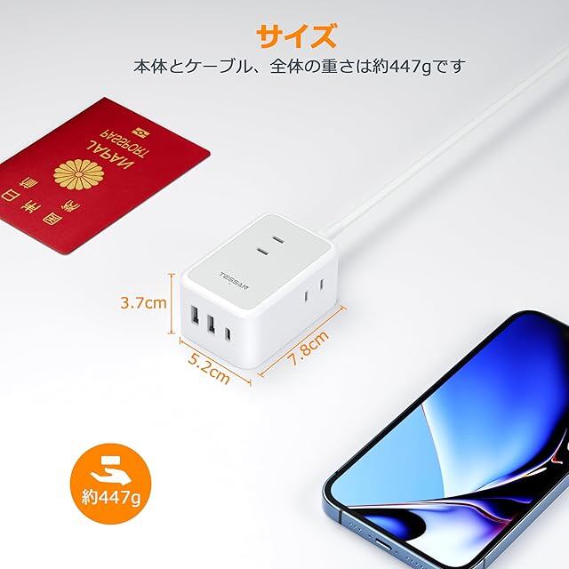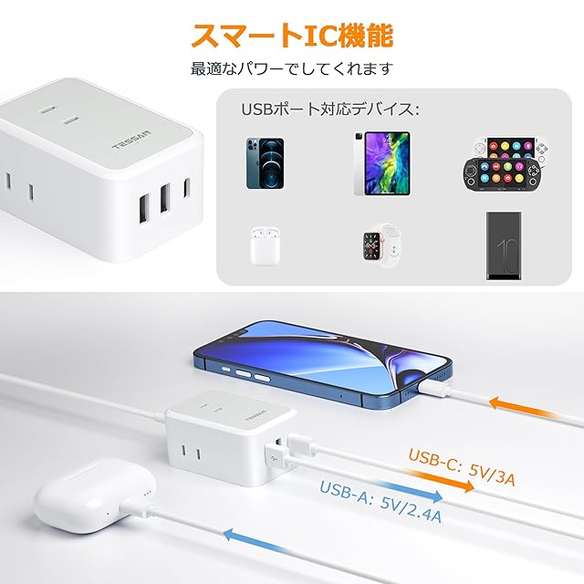 商品名:延長コード 5m 電源タップ usb たこあしコンセント テーブルタップ TESSAN 3個ACコンセント 1個type-c 2個タイプAポート タコ足配線 電源コード マルチ スイングプラグ oa 壁掛 卓上