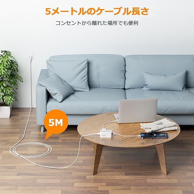 この電源タップは、シンプルで落ち着いた灰白色デザインで、どんなインテリアにも調和します。3つのACコンセント、2つのUSB-Aポート、1つのUSB-Cポートを備えており、最大1500WのAC電力を安定供給します。5メートルのケーブル長と回転プラグが、設置の自由度を高め、使用環境に最適な配置が可能です。使いやすさとスタイリッシュさを兼ね備えたアイテムです。