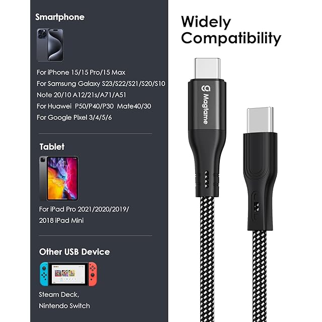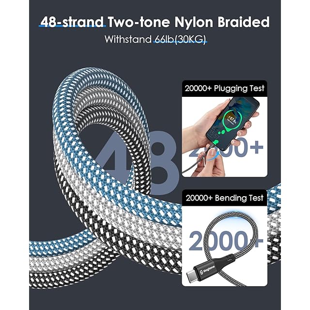 高耐久48番手二重ナイロン、3次元編み込み技術:Magtameタイプシーケーブルは高耐久48番手の二重ナイロン4層構造を高密度編組で耐久力に強化しています。更に3次元の編み込み技術により断裂を防ぐタイプcタイプcです。