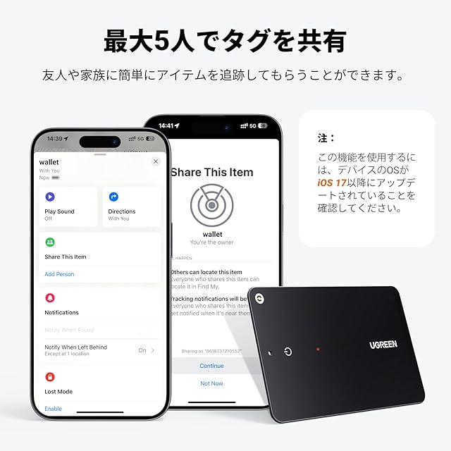 商品名:UGREEN FineTrack Slim Smart Finder 紛失防止タグ トラッカーカード スリム1.7mm超薄型財布ファインダー、SmartTrack Card、Appleの「探す」に対応 (iOS端末のみ) 、スマートタグ、スマートトラッカー IP68防水 置き忘れ防止/スマホ鳴らす 財布、キー、荷物タグ用 【充電式】