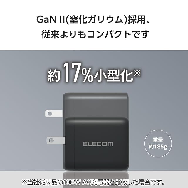 GaN II(窒化ガリウム)を採用し、高出力ながらコンパクトサイズを実現。プラグ部分も折り畳むことができるため、バッグの中でもスペースを取らず、ビジネスでの外出やリモートワーク、出張、旅行など持ち運びにも便利です。