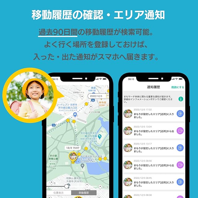 【子どもやご高齢者の行動がわかる】お子さまやご高齢者がどこにいるのか、どんな経路を通ったのか、アプリの地図上に表示します。移動履歴は、過去90日前まで保存されます。