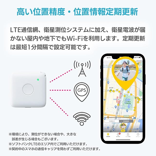 ※GPSの特性上、位置情報にズレや遅延が生じることがございます。(リアルタイム更新ではございません。)トラッキングの更新間隔を短くすることで改善される場合がございます。※GPSの電波が届きにくい場合他の通信方法により位置情報の取得を行いますが、切り替えの際に一時的に位置情報の取得が停止し、ランプが停止/点滅することがあります。 ※ランプが点灯しない場合は、バッテリー切れの可能性がございます。まもサーチアプリで充電量を確認のうえ残量が少ない場合、または本体のボタンを押した際に赤く点灯する場合は充電してください。