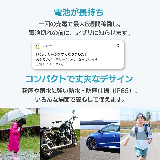 【丈夫でバッテリー長持ち】1回の充電で、最大で8週間の見守りが可能。(現在地更新間隔3分)。バッテリー残量が少なくなるとスマホに通知して、バッテリー切れを防ぎます。※本体1年間の付き。※付属のケーブルはType-A-Type-Cになります。付属品以外のケーブルを利用する場合はType-A-Type-Cをご利用ください。また、別途充電コンセントをご用意ください。