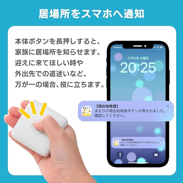【現在地発信】まもサーチ 3本体のボタンを長押しすれば、「いまここ!」と保護者のスマホへ現在地を発信することもできます。迎えに来てほしい時や外出先の道で迷った時、万が一の場合に役立ちます。