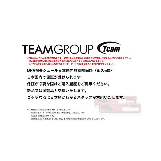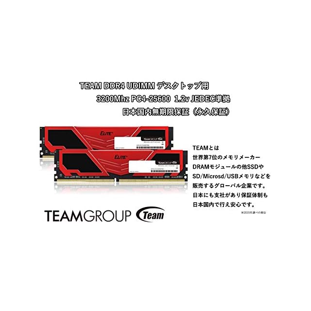 Team デスクトップ用DDR4 3200Mhz PC4-25600 。デスクトップPCの増設用などに。TEAMとは世界第7位のメモリメーカーです。DRAM等を世界各国へ販売しています。DRAMのほかに、SDカードやmicroSDカード、USBメモリもなども取り扱っている世界的なメーカーです。日本国内に支社もあり体制も日本で行えて安心です。