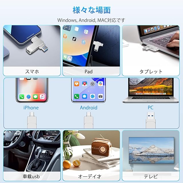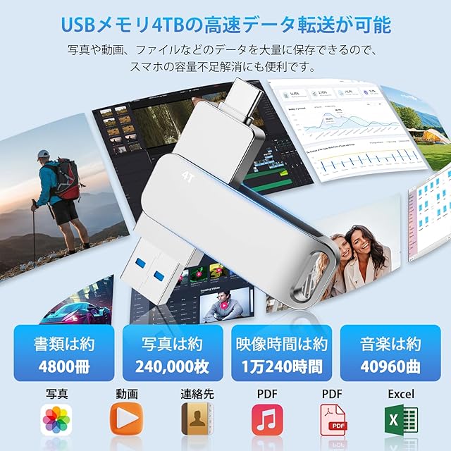 【4TB USBメモり 】スマホの写真や動画が多すぎて、スマホのメモリが足りなかったらどうしよう? この4TBのUSBメモリを使って、この悩みを解決しましょう。4TBのスマホUSBメモリでストレージを拡張でき、スマホを容量不足から徹底的解放させます!本製品は、type-c接続をサポートするすべての携帯電話に対応しています。