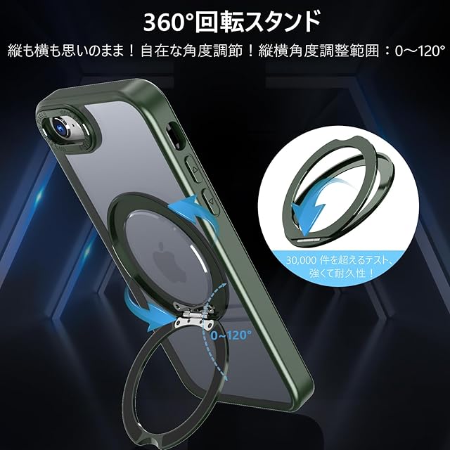【360°回転スタンド · 縦も横も思いのまま】多機能スタンドとリング一体型の斬新なデザインです。ケースを閉じれば背面はスマートに平坦に。縦置きでも横置きでも安定して支えられ、0°~ 120°の間で多角度自由に調整できます。ケースを開けるだけでスタンドの完成!指にかければリングも便利に使用でき!また、安定したアルミ合金製の円形スタンドを採用しており、携帯性からもファッション性からも唯一無二の存在です。