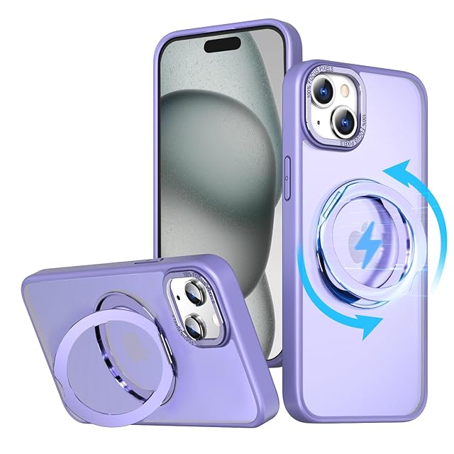 KWATUNG 互換品 ケース iphone 15 plus 用 ケース magsafe対応 ワイヤレス充電 iphone15plus 用ケース スマホ 落下防止 いphone15plus 用ケース 360°回転スタンド 縦横両対応 アイホン15プラス用ケース マグネット搭載 アイホン15plus用ケース 防指紋 米軍MIL規格 6.7インチ 半透明 マット感 ライトパープル