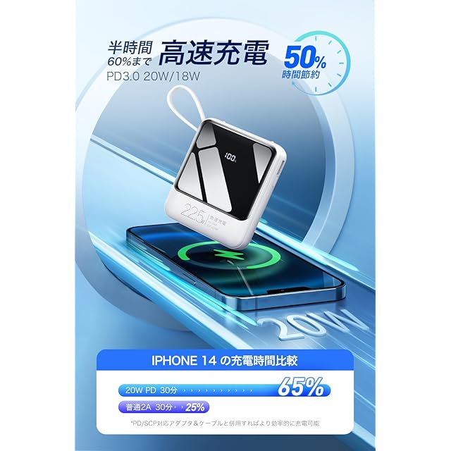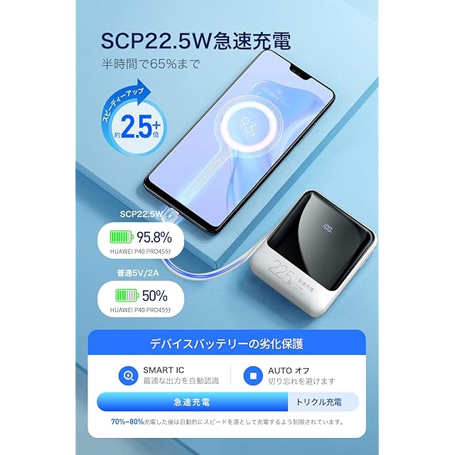 【PD20W/SCP22.5W急速充電バッテリー】PD3.0対応し、業界トップクラスの高速充電を誇り、わずか30分で0%から60%ほどにスピード充電可能。1.0Aに比べて充電速度が約5倍速く、充電時間を大幅に短縮しました。これにより、外出先でも短時間かつ効率的な充電が可能となり、さらなる利便性が提供されました。急に思い立った旅行でも、パックしている間にフル充電することができ、すぐに出かけることができ、まさにハイパワーな小型モバイルバッテリーです。