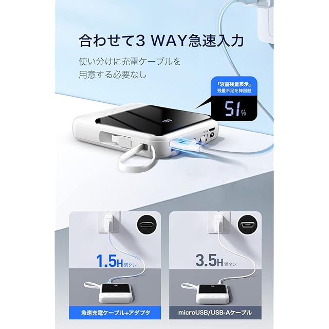 【3Way蓄電 LED照明ライト付き】バッテリー本体への充電はType-C入出力ポート、内蔵USB-A入力ケーブル及びmicroUSB入力ポートの3種類から選べます。Type-CポートはPD規格で最大18Wまで入力可能、ケーブルとアダプター両方とも急速充電対応ものと併用すると1.5Hでフル充電となります。また、LED照明ライト付き、夜道や停電時で懐中電灯代わりに使え、緊急時にも役立ってくれます。