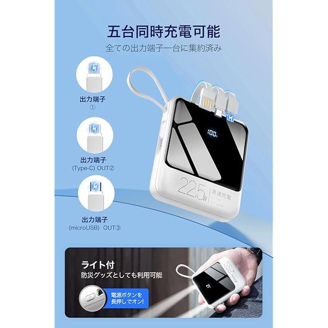 商品名:モバイルバッテリー 大容量 22800mAh 【210g超軽量 4本ケーブル内蔵】 小型 PD20W 急速充電 SCP22.5W対応 5台同時充電 携帯バッテリー LCD残量表示 スマホ 充電器 ストラップ付き 持ち運び便利 LEDライト付き コンパクト 携帯充電器 パワーバンク 旅行/出張/アウトドア/停電/防災緊急用 iOS/Android各種他対応 機内持ち込み可能 (ホワイト)